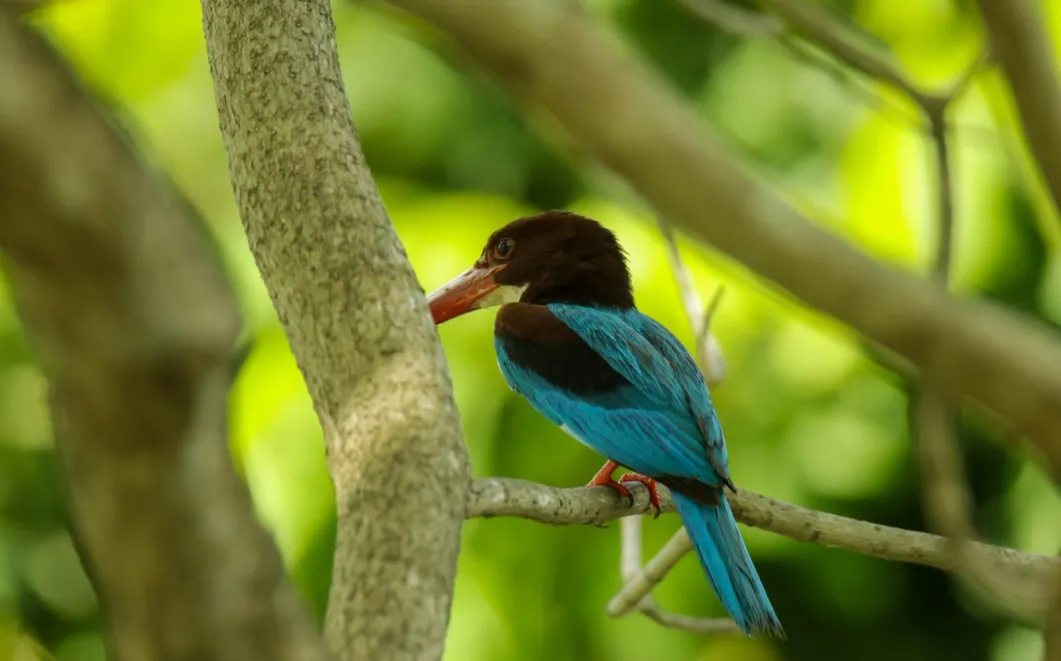 The camp sits within a vibrant ecosystem: teak and bamboo line the paths, orchids cling to branches, and butterflies flash in the sunbeams. Look for kingfishers and hornbills.