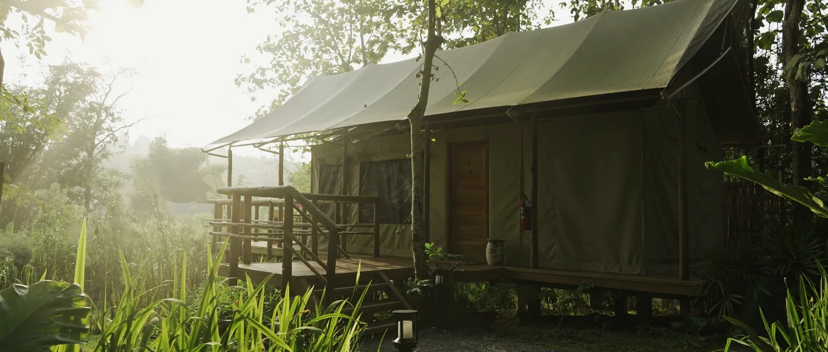 The camp seamlessly blends luxury with environmental care, offering a unique stay experience unlike any other camp. Our canvas tents, crafted from sustainably sourced materials and situated on elevated wooden platforms, minimise their impact on the forest. Unique eco-friendly features—including energy-efficient lighting and locally crafted furnishings—distinguish our accommodations. Guests enjoy king-size beds and open layouts with forest views: a distinctive balance of elegant comfort and environmental responsibility.